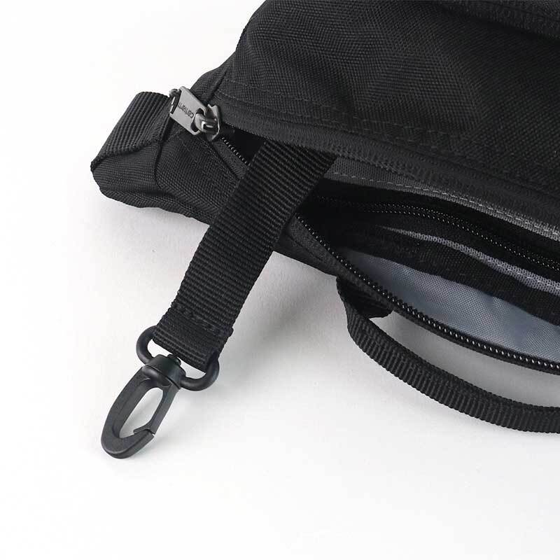 仕様 :開閉 ファスナー、外側 ファスナーポケット×1、内側 ファスナーポケット×1、カラビナ×1