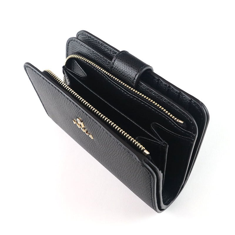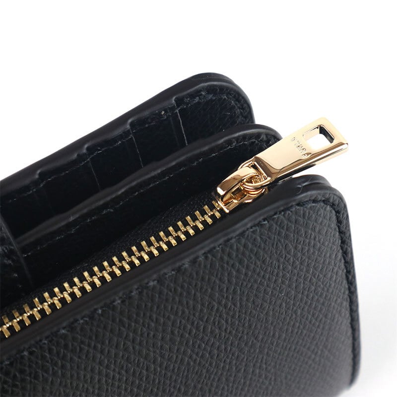 コンパクトで使いやすいミディアムサイズの二つ折り財布。FURLAの「CAMELIA」シリーズで、上品なブラックカラーが魅力です。持ち運びしやすく、デイリー使いからお出かけまで幅広いシーンで活躍します。