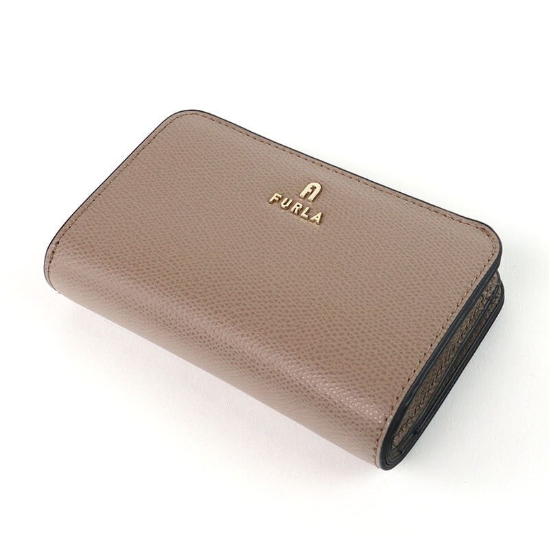コンパクトで使いやすいミディアムサイズの二つ折り財布。FURLAの「CAMELIA」シリーズで、上品なグレージュカラーが魅力です。持ち運びしやすく、デイリー使いからお出かけまで幅広いシーンで活躍します。